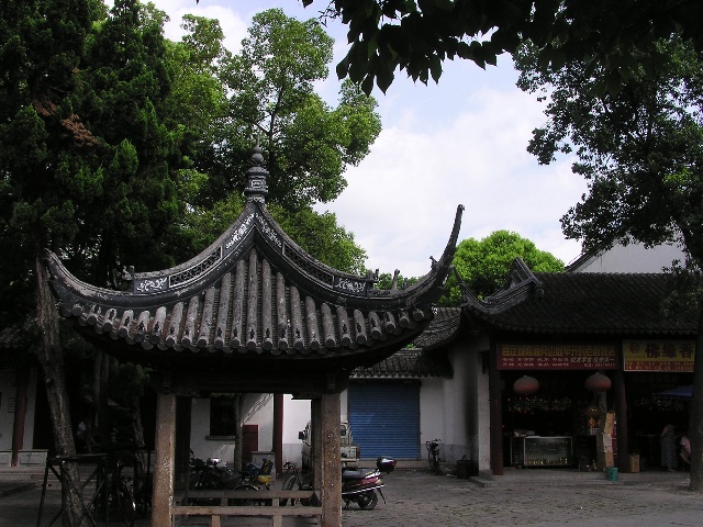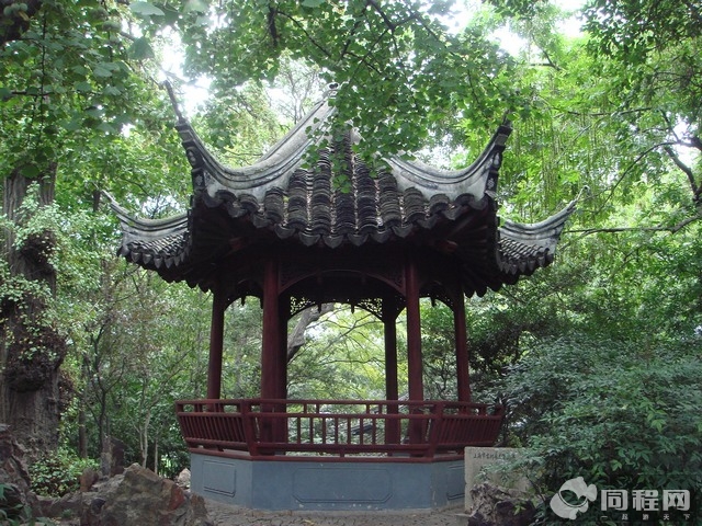 〖井亭〗 兩只亭均為原邑廟遺物,內有井,位于園東南大門外兩側。亭皆方形,飛檐翹角,斗拱花板。經1986年修葺,檐口置人物塑像,亭內天花板鐫雙龍戲珠圖,四周設石欄連四柱。