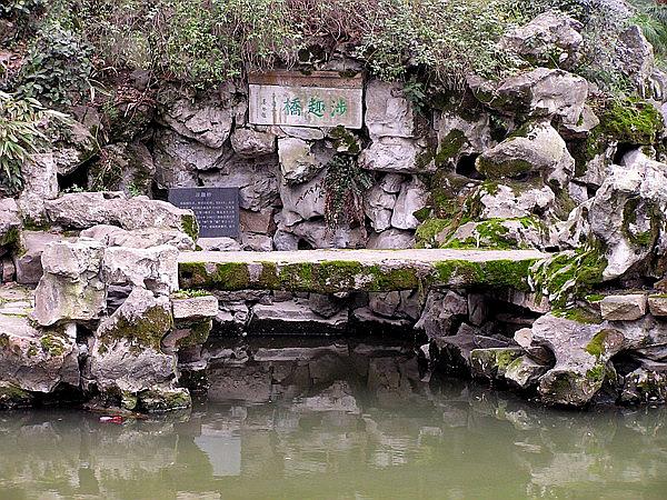 〖南山、霽霞閣、仙人洞、晚香居〗 南山位于桃花潭南岸,以湖石夾土筑成,東西長40余米。山有南北兩崗,崗上林木遮天蔽日。北崗有疊成牛、馬、羊等動物形狀的湖石。南崗有霽霞閣,方形,面積6.3平方米。此閣原建于金氏園,毀于清咸豐庚申(公元1860年)兵燹,1985年重建,由百歲老人蘇局仙題行書額。出霽霞閣,經長約5米的仙人洞,即抵位于南崗東南腳下的晚香居,此居為1985年新建,由闕長山題額。居前有小院,植四時花木,散置湖石。居后有廊,通賓藻風香室。