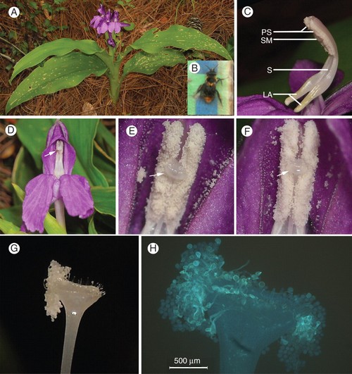 插圖:A:長柄象牙參的植株;B:在野外捕獲的訪花頻率極低的昆蟲;C:花內部結構(PS-花粉囊,SM-柱頭,S-花柱,LA-杠桿狀雄蕊附屬體);D:開花前去除了花粉囊的花,用來檢測傳粉者對種子產量的貢獻。E-F:自花傳粉的方式(E:花開第一天時的柱頭狀態,箭頭指示柱頭上有少量萌發液;F:花開第三天時的柱頭狀態,箭頭指示柱頭上的萌發液聚集成一個小液滴聳立于柱頭之上;G:花開第四天時的柱頭狀態,柱頭粘住旁邊的花粉;H:花開第四天時的柱頭染色后在熒光顯微鏡下觀察的狀態,花粉在柱頭外面萌發,花粉管伸入柱頭)