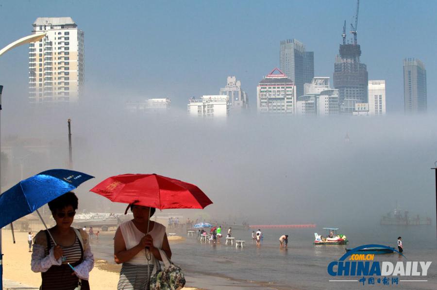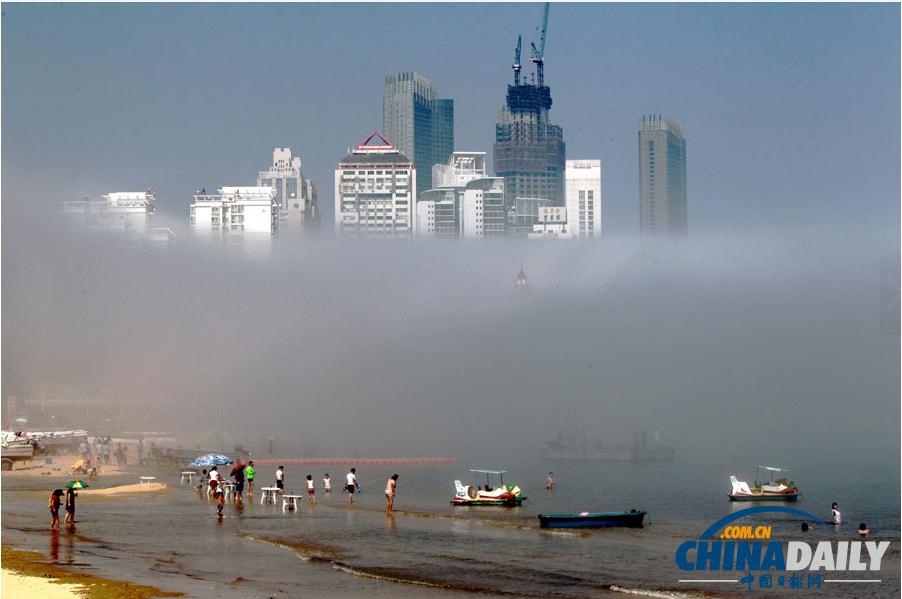2012年8月2日,山東煙臺,濱海建筑在平流霧映襯下仿佛海市蜃樓。