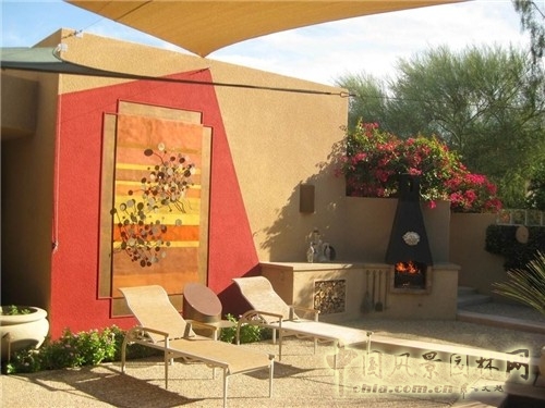在這個現(xiàn)代化的沙漠景觀風格的院落里,戶主很想要一些特別的東西。壁爐下面的長凳被粉飾以金黃色,有種張揚壁爐的效果。在戶外景觀中,黃色是愉悅的積極色調(diào)。在這里,搭配金黃色的是周圍地面的灰色巖石。而且,炎熱地區(qū)應用這種顏色還有另一個優(yōu)勢:它不會像其他深色一樣吸收吸收大量的熱,從而可以確保座椅不會炙熱難坐。
