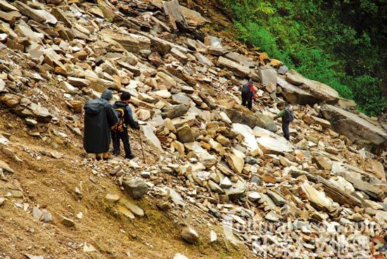 最危險的塌方區在月兒冬橋和快到背崩的解放大橋之間。這里,山上飛流直下的瀑布仿佛來自天外。風光實在太美了,可塌方區卻擋在了我們眼前,山體剛剛崩塌過,塌下的碎石早已被多雄拉河沖走,接近90度的坡度,我們幾乎沒有落腳的地方,距水面20余米,稍不留神就會掉下去,要命的是還有落石不斷從山上往下滾。我不記得是怎么過去的,過去后每個人都虛脫了,從背包里拿了不少食品來補充,歇了很久心還怦怦跳,腿還不停地發抖。