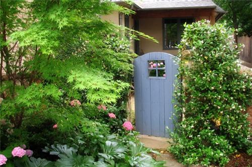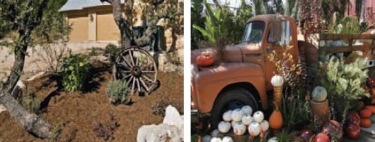 鄉村式景觀常會設計一些趣味場景,但都與自然的主題統一。如:選種較為古老的植株,旁邊配上一輛老式貨車、手推車或澡盆,但要確保不影響植物的排水;花園里的裝飾盡量能夠凸顯藝術性。如破陋的鐵鏟、生銹的水壺,更能為花園增添一些古典魅力;幾個懸掛的采摘籃筐絕對可以極好地修飾鄉村式花園,如在門廊上掛兩三個籃筐。好的造景是將不同結構和色彩的喬灌木很自然地融合在一起。