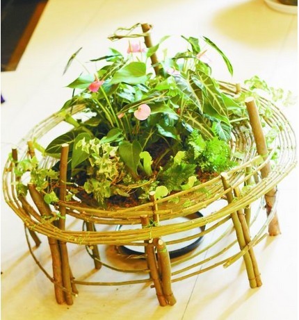 云龍柳做成的構架不僅可應用于花藝,也可使組合盆栽花卉翻新。在第12屆中國花卉零售業交流會上,臺灣花藝師徐進聰就以云龍柳編織成巢狀架構,加入小粉掌、火鶴、觀音蓮、常春藤等,做成了這個郁郁蔥蔥、充滿自然風情的組合盆栽構架作品。