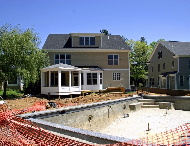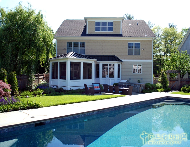 水池定點45度角方位設計,開辟了幾乎所有的設計挑戰的解決方案。在這個角度,游泳池36英尺長18英尺寬,留點空間最后作為一個曬太陽的位置,可以考慮加入一些庭院的感覺。