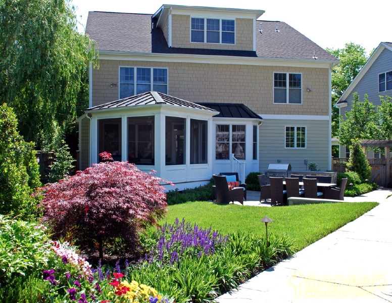 棚架式的長廊有足夠的空間用做進(jìn)餐區(qū)和休息區(qū)。燒烤位置設(shè)在一角,方便把AC單元藏在下面,烤架被放置在一端,毗鄰一個超大的餐廳露臺。草坪擁有曲線美,種植的特點是每個季節(jié)都有鮮花盛開。