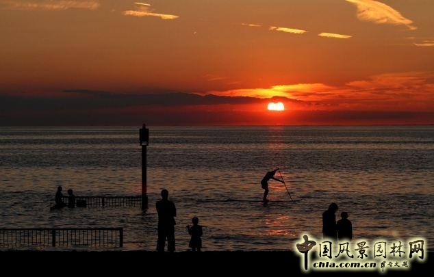 驚險一幕:在太陽即將消失在海平面之前觀看華麗的一幕——漿式?jīng)_浪板沖浪