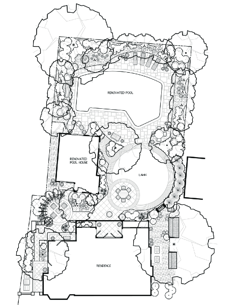 原有的游泳池是獨立存在的,周邊圍繞尖樁籬笆柵欄,一個藤架式長廊連接房子和泳池別墅,在游泳池旁。背后的景象僅僅是個破舊的老車庫。種植的花木完全雜亂無章,其間雜草叢生。
