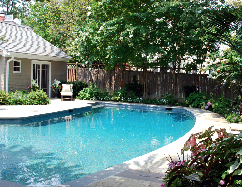 翠綠的巨柏遮住了鄰居車庫的視野,而且強調圓形草坪面板。樹枝橫溢斜出,背影倒映在游泳池上方。庭院種植南部喜溫植物的靈感來自于八仙花,五彩芋和熱帶植物如藤蔓植物和觀賞棕櫚的用途廣泛。中央噴泉的設計表明了這是一座查爾斯頓風格的庭院.。