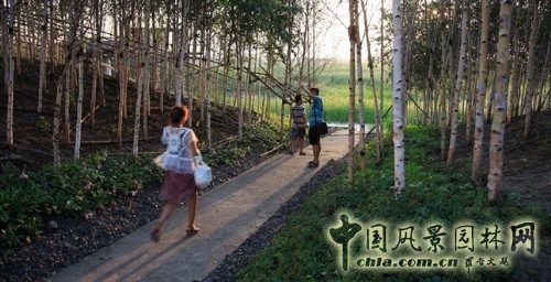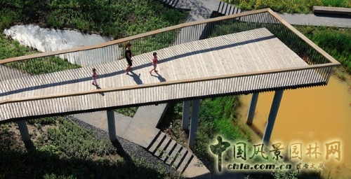 4.在池塘和土堆上面的長長天橋又為游客提供了俯瞰濕地和感受蒼穹的體驗。觀光臺、五個帳篷(竹子、木頭、磚、石頭和鐵為建造材料)、兩個觀光塔(鐵質和木質,木質塔就像屹立在西北邊的一棵高樹)都可以由天橋到達,使游客在公園中心的上空感受到這個自然景觀。