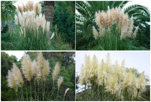 蒲葦Cortaderia selloana,禾本科蒲葦屬草本植物,莖叢生,雌雄異株,葉多聚生于基部,極狹,長約1m,寬約2cm,下垂,邊緣具細齒,呈灰綠色,被短毛。圓錐花序大,雌花穗銀白色,具光澤,小穗軸節處密生絹絲狀毛,小穗由2—3朵花組成。9—10月,秋風颯爽,蒲葦迎風,正是觀賞、拍攝的大好時候。矮蒲葦花穗長而美麗,庭院栽培壯觀而雅致,或植于岸邊,入秋賞其銀白色羽狀穗的圓錐花序,或用作干花,或在花境、觀賞草專類園內使用,具有優良的生態適應性和觀賞價值。