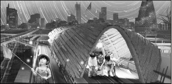 在竹橋上稍遠的位置,設計了9座綠塔,因為該社區聚集了來自9個省份的農民工,綠塔采用荷蘭式的立體農業,可供耕種。