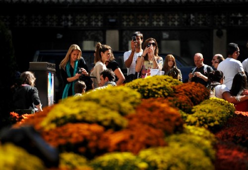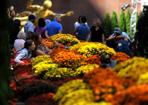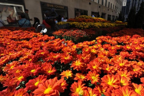 近日,在美國紐約洛克菲勒中心廣場,游客流連在菊花叢中。初秋時節,數萬株菊花被擺放在紐約曼哈頓地標建筑洛克菲勒中心廣場,吸引了大量游客和市民駐足觀賞。