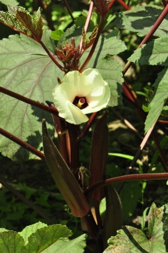 紅秋葵是一種可觀賞美麗花朵的蔬菜,是咖啡黃葵(Abelmoschus esculentus)的園藝品種。生長在枝頂的又長又尖的紅色果實,外形似辣椒,加之原產地是美洲,故又稱為洋辣椒。嫩果莢可炒食、煮食和涼拌。嫩果莢中,黏滑的汁液含有果膠、牛乳聚糖和阿拉伯聚糖等營養物質。據研究,紅秋葵還有降血壓、幫助消化、預防大腸癌和滋陰壯陽等功效。