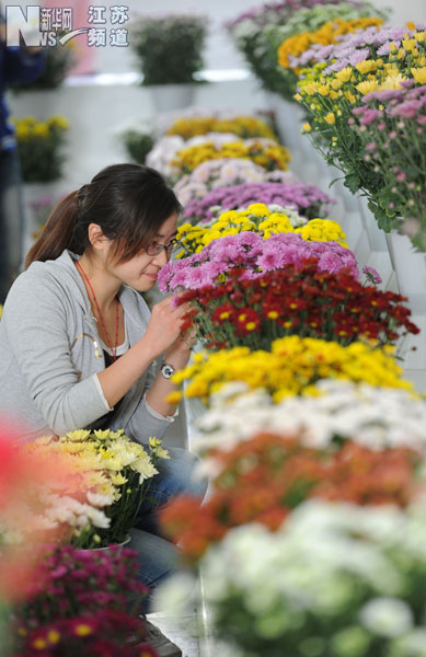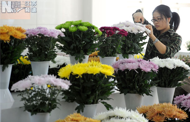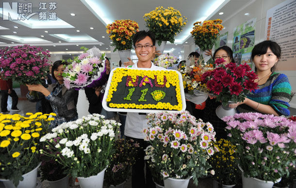 一名學(xué)生在展示用菊花擺放成慶祝南農(nóng)大110周年校慶的圖案