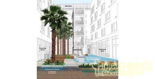Drs. Julian & Raye Richardson公寓是為很多無家可歸的流浪人提供了一處舒適的家居場所,由120個單元房和一些服務性單元組成,包括咨詢幫助、醫療保健、工作培訓和就業中介。項目設計包括街景、中央庭院、屋頂露臺以及量身定做一些庭院設備。項目中的材料主要來源當地。滲水性砂石地鋪、雨水花園和綠色屋頂都具應對雨水的功能。