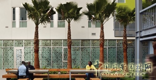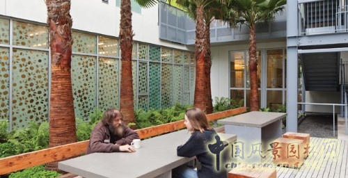 定做的庭院小品設備包括桌、椅、有柜臺的燒烤架、木凳,講究高雅、舒適、耐久的設計風格。由于這里的居民約有1/3需依靠輪椅,因此設計師在設計中都會盡量同時滿足輪椅的進入。輪椅通道很完美地被設計在庭院里,可以走過座椅,到達懸吊桌子邊,進入各種活動場所。