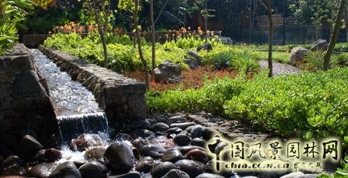 河道周圍栽植箭葉喜林芋、景天、香蕉樹