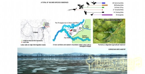 蓮花湖位于鐵嶺舊城西南部15公里外,屬淡水沼澤濕地,是中國第7大河流,上世紀筑起的用于灌溉和防洪的蓄水池,經歷了五十年的使用,面臨到一些嚴重的問題,包括不斷出現的干旱缺水、野生物棲息地環境惡化、有毒污染物嚴重等。但盡管如此,蓄水池仍然是東亞鳥類的主要遷徙棲息地。