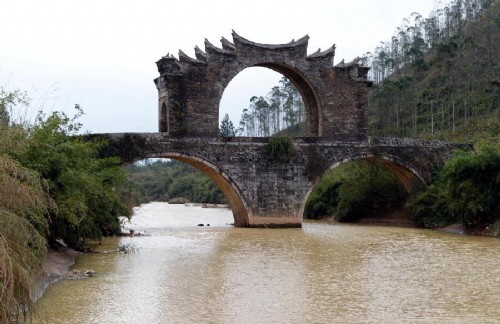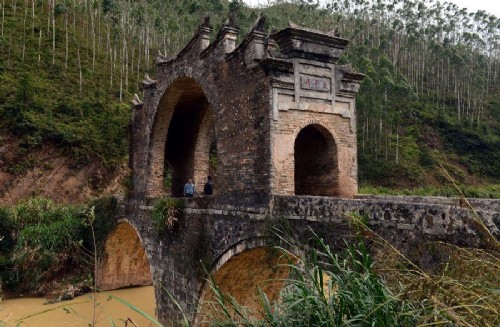 在江西龍南縣楊村水口嶺有座歷經二百多年滄桑風雨的古橋——太平橋。該橋長50米,寬4米,高17米,整座橋為兩孔三墩,四拱雙層重疊組合,由磚石、磚土及精磨花崗巖砌成,橋上為長30米、高10米磚木構筑的四通涼亭,古樸奇特。