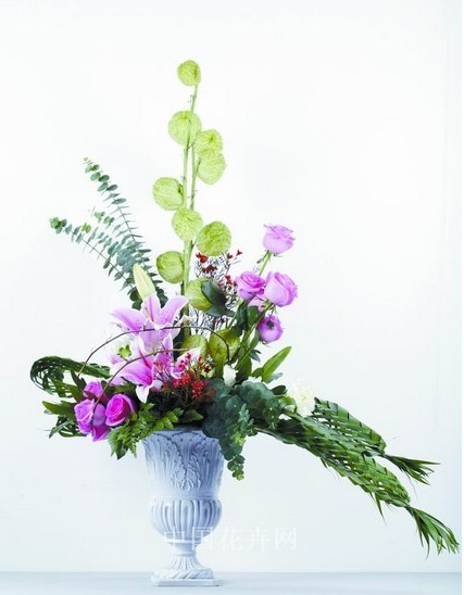 顏色搭配:使用大量的綠色葉材插作作品的輪廓,讓作品的基調非常清新,在視覺中心插入些許粉色百合及玫瑰,量雖不多,卻是點睛之筆,讓作品又生出溫情及浪漫的氣氛。