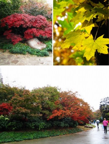 值得一提的是,槭樹園作為集中種植槭樹科植物的專類園,各種色葉樹相繼變色,層林盡染,是植物園秋季最美的地方之一。槭樹園位于植物園的西南側(cè),靠近植物園三號(hào)門,占地5萬平方米。園內(nèi)以青楓、紅楓、羽毛楓、樟葉槭、五角楓、中華槭、羅浮槭、三角楓、弗里曼槭、元寶槭等槭樹科植物為主,配以喜樹、重陽木、七葉樹、黃連木、南酸棗、欒樹、無患子、銅錢樹、燈臺(tái)樹等,主要展示薔薇亞綱除薔薇目、豆目以外的植物種類,共有160多種植物。另外,蘭室、盆景園內(nèi)色葉樹眾多,秋色也毫不遜色,值得一看。