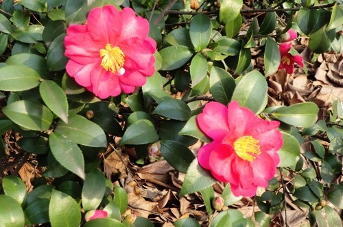 上海植物園的杜鵑、山茶園有幾叢緊簇的灌木,葉片上綴滿了紅色的斑點,不斷開放出艷麗花朵,直徑4—5厘米左右,有紅花、粉花和白花,這種冬日里綻放的美麗植物就是茶梅。