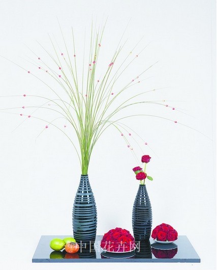 圖為現代花卉靜物作者:黃秀兒設計理念,以現代感花器與細的線條及點狀花卉組合,表現空間與花卉浪漫對話的氛圍。