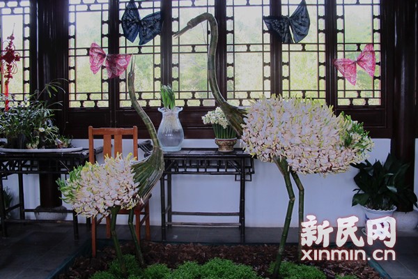 圖說:將水仙球“種在”竹鶴上,形成了一對(duì)獨(dú)具特色的“香鶴”。新民網(wǎng)記者 袁蓉 攝