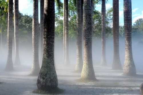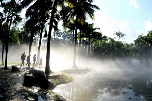 熱帶生靈忽感寒,葫蘆寶島冰驟降。一冷一熱天與地,鬼斧神工勝馬良。霧氣繚繞樹木間,美不勝收緣凄涼。