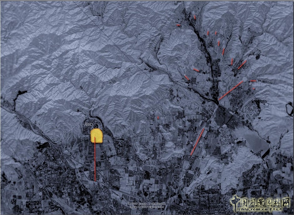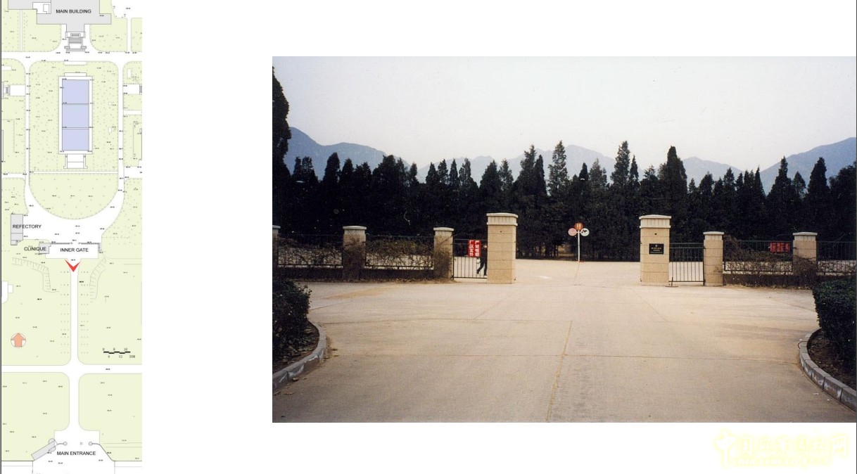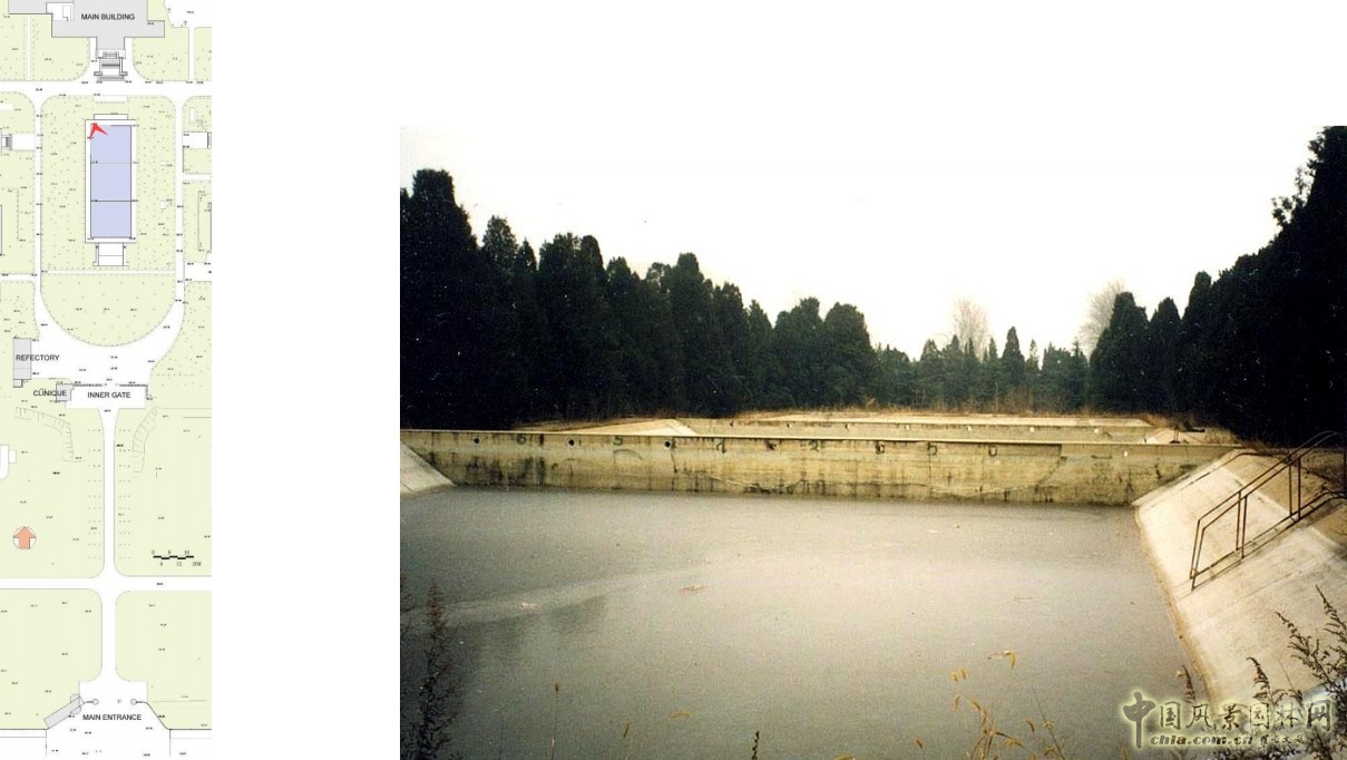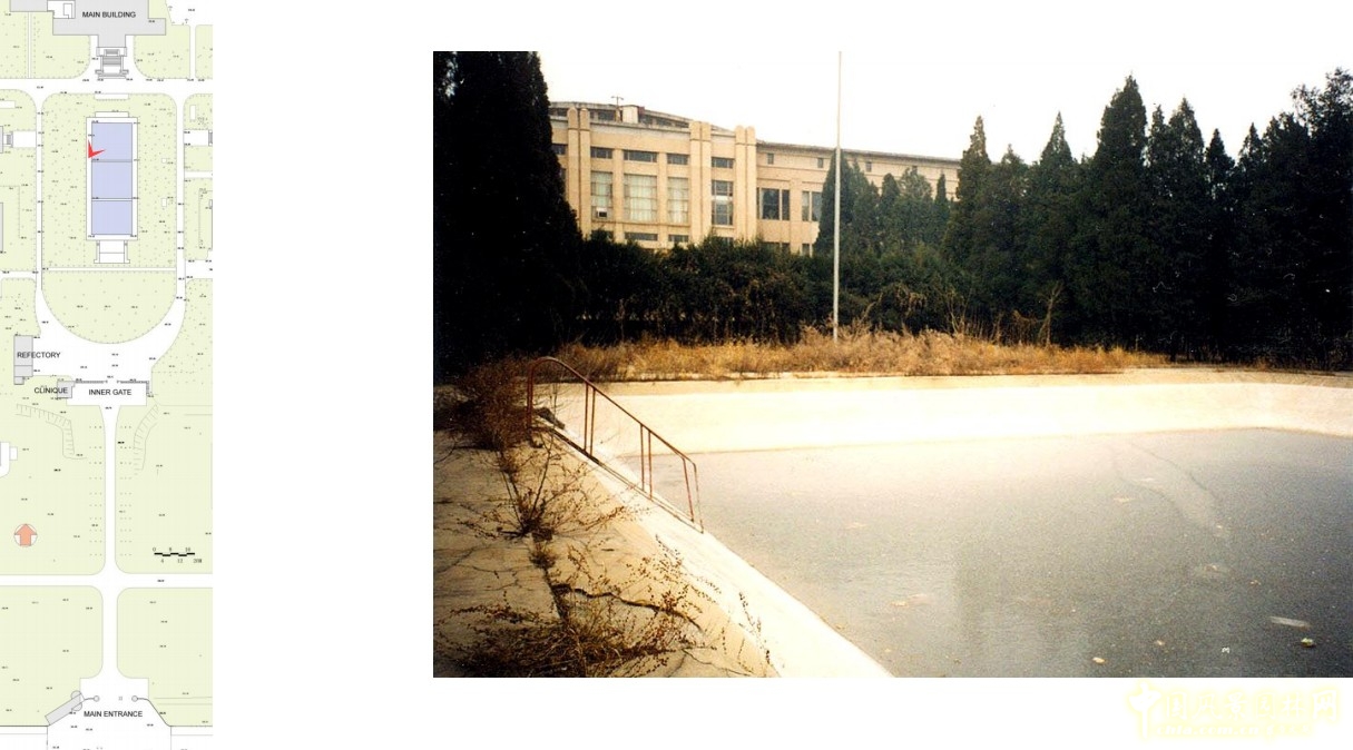 這是一個獨立設計的案例,地點在昌平,十三陵邊上,人稱十四陵的位置,從八達嶺的輔路一直到這邊。我們可以看到在接手這些設計的時候,這些樹長出來了,原因是因為當時文革沒有管,以后就沒法再管了,使得蘇聯式的綠衣變成了綠場。當時說一定要把它去掉,但是我的理由是保護它。我們可以看到中間有一個冷卻池,三個是死水,4米高。當時我提交的方案,目的是為了保留這些樹,所以當時沒有考慮到水池,認為水池簡單的包一下就可以了。不過之后有了一個很深的感觸,就是當你不了解場地結構的時候,很難發現它最大的價值。當時畫圖的時候去勘探現場,發現這個是典型的,非常非常典型的西方古典園林。當你知道延展性是它最重要一點的時候,你發現設計忽略了這最重要的一點,當我知道犯錯之后就調整了設計。這是規劃里面典型的蘇聯式,這是開放性,首先要保證它的延展性,這個的力量是最大的,這種結構會被激發出來。當時因為被樹屏蔽掉了,導致我把這些池子砍掉了,結果水量由百分之百縮減到了25%,縮減了四分之三,原來三個池子變成了一個池子。
