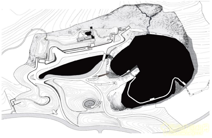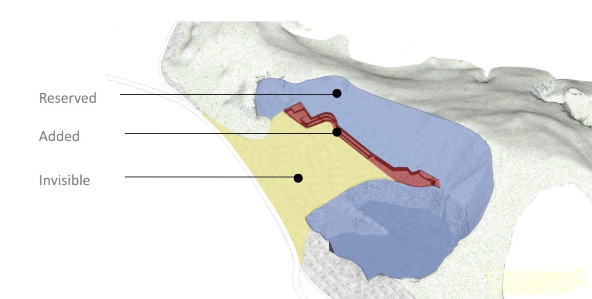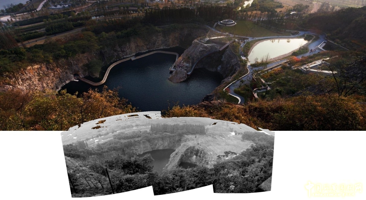 我們面臨的一個問題就是,山體大量的斜面是非常危險的,應該如何去處理,還有平臺區,有非常不好處理的特別平臺。這是石山,底下都是石頭,這里面為什么要堆一個土山,就是因為這個原因。當時事務所的基本的概念是不要碰它,保持這樣,但是我去完現場之后,看法有所改變。中國人有一個特點,一定要是跟山水融為一體的。所以不管通過什么方式,我必須得下去。在這兒看特別像一個洞,就在這兒做了一個山洞,這個山洞連是接東西礦的一個通道,是保證安全必須要做的事情。在這一側是非常好的,最后看著像手術刀,通過坡道的一側,下去以后經過一線天,太危險了。