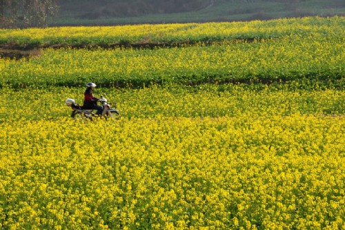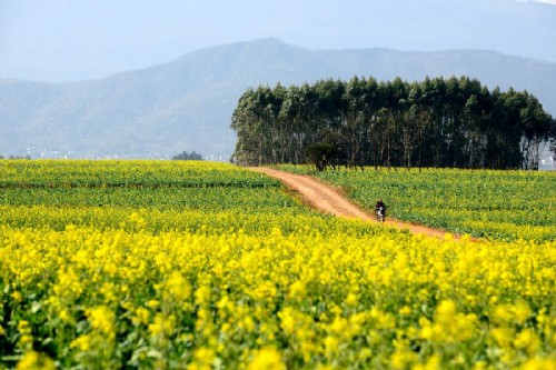 騎車人從云南羅平成片盛開的油菜花中經(jīng)過