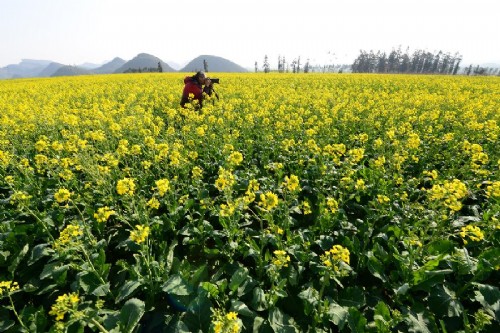 攝影愛好者在拍攝云南羅平盛開的油菜花