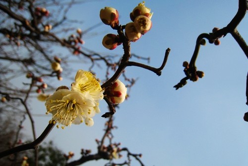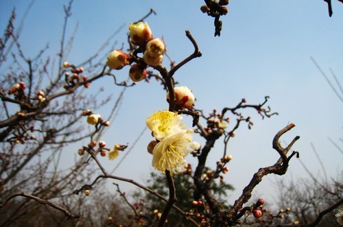 2月4日便是立春了,隨著近期氣溫的快速回升,上海植物園薔薇園里的梅園已不再是寒風蕭瑟,“報春粉”梅、單瓣的朱砂梅、粉白色的“江梅”等一些花期較早的梅花Prunus mume品種已星星點點地在枝頭綻放,迅速傳遞著春天的消息,而其中,最引人矚目的人氣王,當屬“玉蝶龍游”梅。
