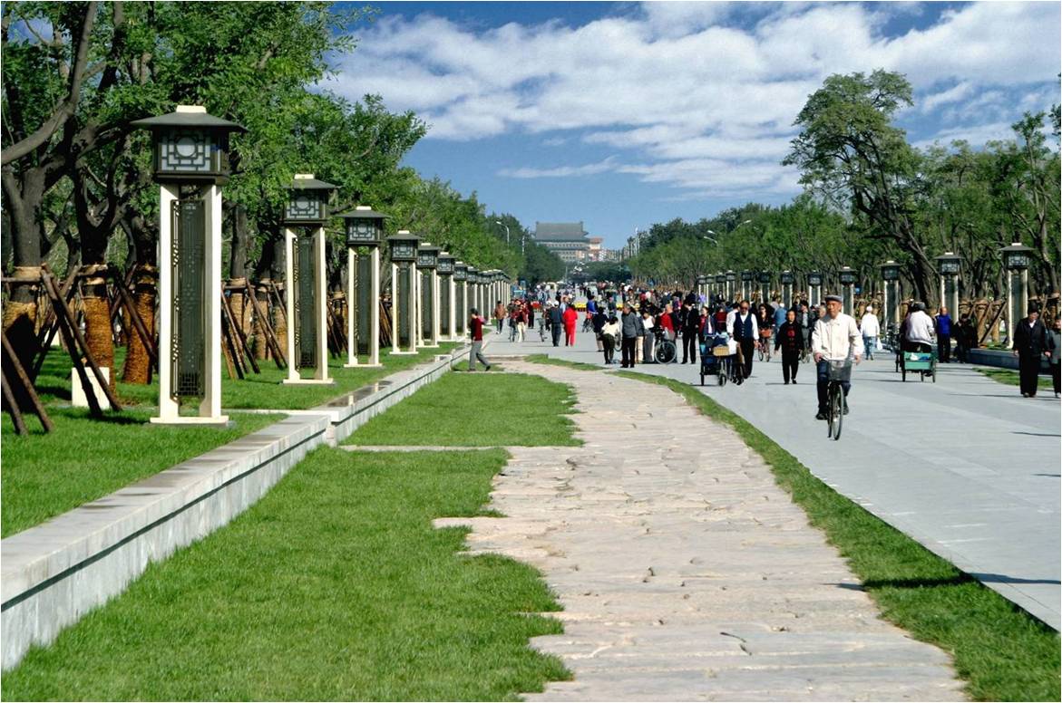 南中軸綠地北頂正陽門,南接永定門,面積近12萬平方米。在建設中挖出了原有的御道,只此就已經(jīng)體現(xiàn)了十分厚重的歷史文化信息,所以除了一個日晷和嘉量的石雕以外,沒有做任何其他小品,只在燈柱、座椅上做了一些古典的紋樣。這是最恰當?shù)谋憩F(xiàn)文化的方式。