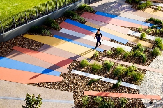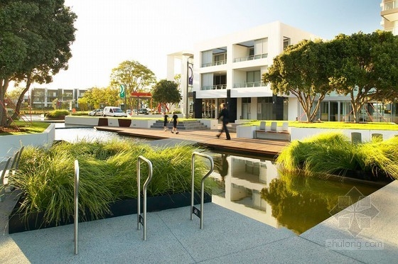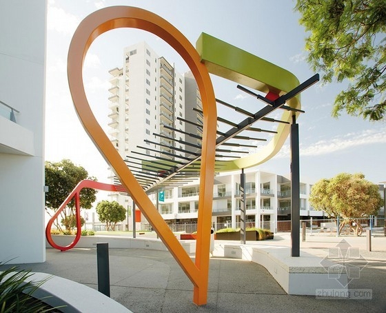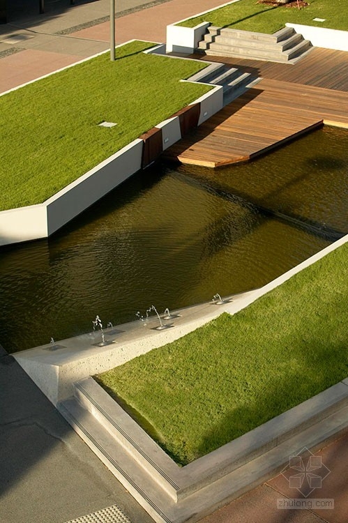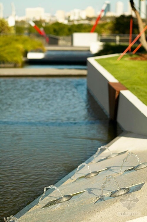 該項目位于西澳大利亞珀斯地區,整個項目的設計運用“切”的手法,每一個空間都被定義為一個總的性格類別,行人空間的優先次序通過混凝土材料區分,拋光混凝土在原有的大型景墻和雕塑的基座增加了一個更精細的細節,開闊的草地空間和移栽的大樹與木材甲板和水道的花槽等景觀元素,構成了一個充滿活力的開放空間。