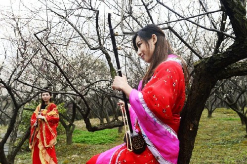 身穿漢服的女樂手在杭州西溪國家濕地公園盛開的梅樹下演奏民樂