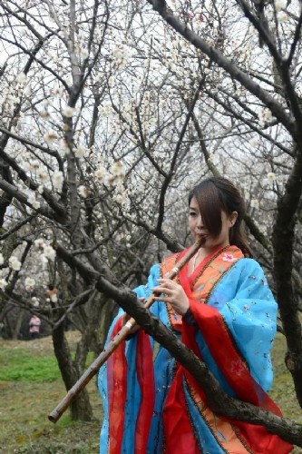 身穿漢服的女樂手在杭州西溪國家濕地公園盛開的梅樹下吹奏長簫