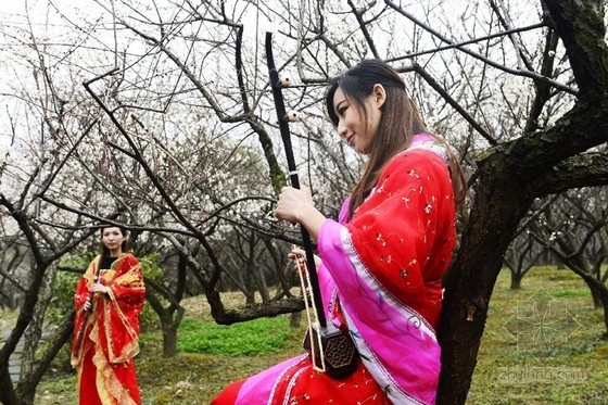 身穿漢服的女樂手在杭州西溪國家濕地公園盛開的梅樹下演奏民樂