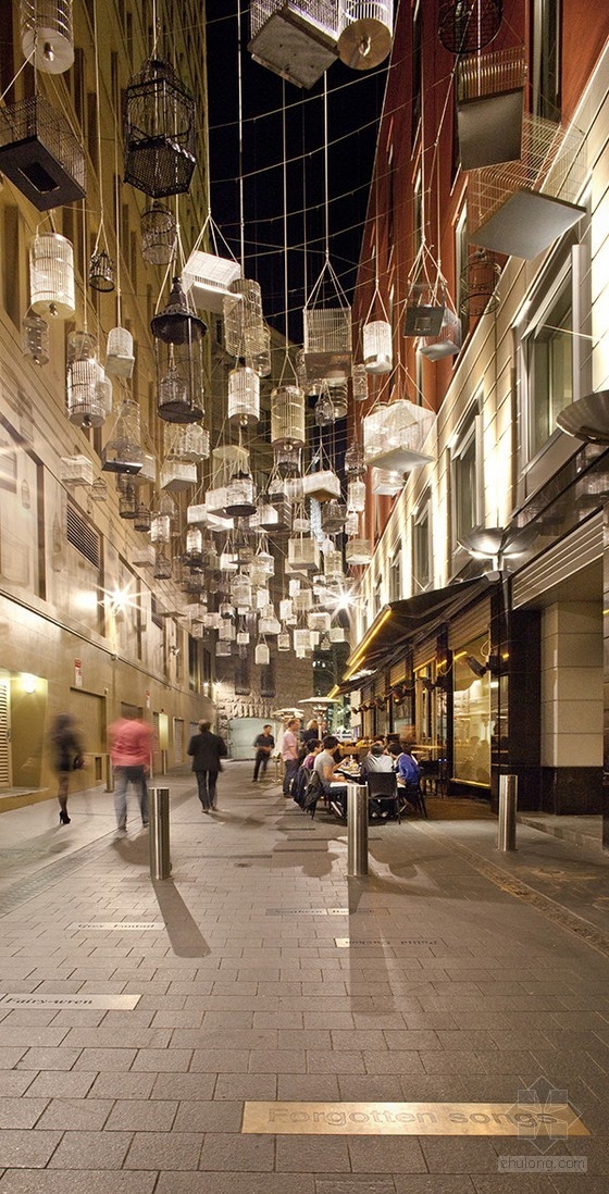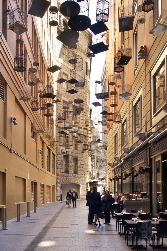 這次的城市街道空間景觀改造,目的是重新激活悉尼大量具有歷史意義的街道。街道改造分兩部分進行:一方面設計師們對這里的街道、 景觀照明、道路鋪裝進行了重新改造升級,并加入了一個新的雨水排放系統。更重要的是在這里創建了一個共享的交通環境,促進步行和自行車交通。另一方面,街道的公共區域中懸掛上了不同形狀的鳥籠,提醒人們這里曾是鳥的棲息地。悉尼正在經歷轉型,通過舊街道的景觀改造和升級,構建了一個優質的公共區域。