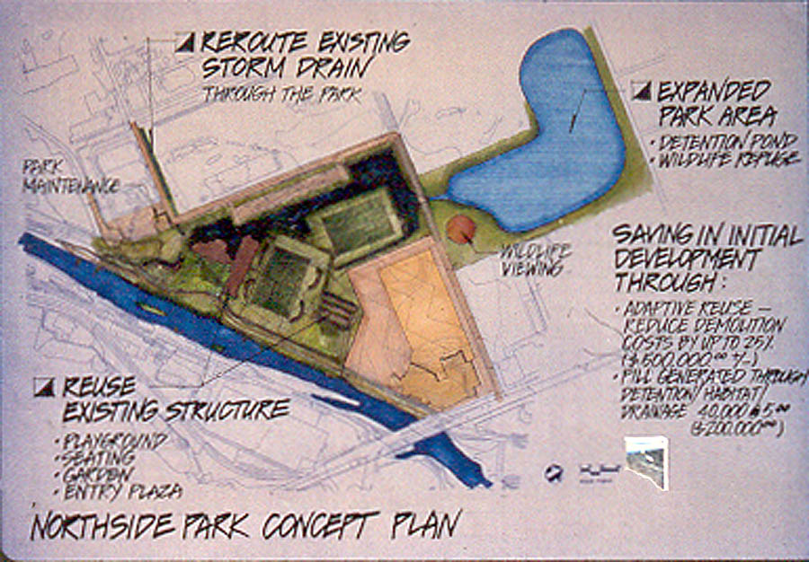 該公園(NorthsidePark)修建在科羅拉多州丹佛市一個廢棄的污水廠之上。該項目的實施,即有助于帶動周邊地區的復興,同是也是丹佛市城市規劃的一部分,該市倡議沿南普拉特河走廊建立了一系列的公園。景觀設計師改建并再利用污水廠已有的結構,在設計中將場地上獨特的地表痕跡保留下來,成為代表其歷史的景觀。