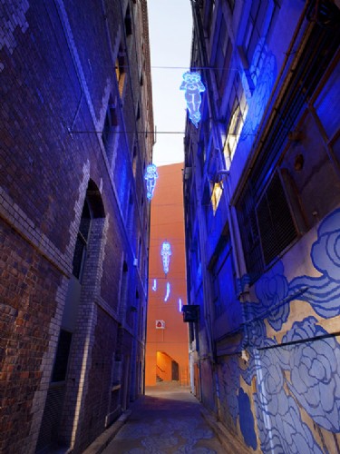 景觀工作室ASPECT Studios對(duì)項(xiàng)目的設(shè)計(jì)包括基礎(chǔ)結(jié)構(gòu)建設(shè)以及地表和空間上的藝術(shù)裝飾,在小禧街和狄克遜街道上,設(shè)計(jì)有花崗巖雕塑、鐵藝、LED燈和懸浮的裝飾元素。工廠街已經(jīng)改造成了一個(gè)娛樂巷,微粒組合的混凝土和鵝卵石做鋪裝。金貝里跨過各條街道。
