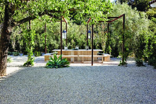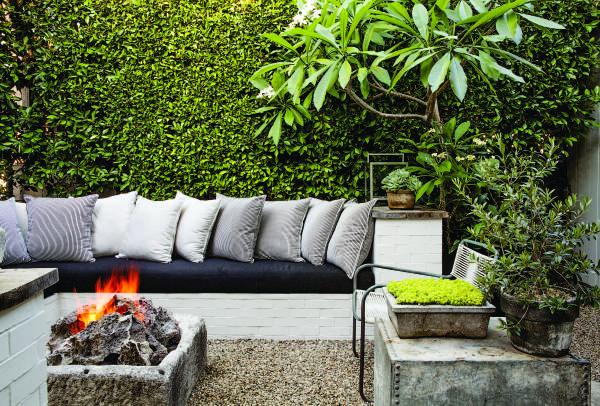 花園中的沙發也是由磚石做成,與旁邊的房屋相稱。中央的篝火臺是由法國一舊水井石做成??繅Φ淖雷邮且粋€倒置了的鐵槽,上面擺放有橄欖盆景,花盆外壁陳舊。其右前方是一株雞蛋花。