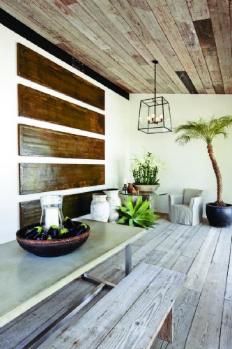 這間小屋,里面的地板、桌子都是回收腳手架做成,并可以作為一處健康理療場所。地板上的盆景是龍舌蘭。