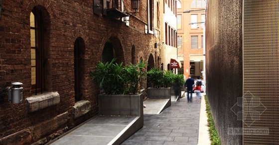 悉尼南方的娛樂區奧爾濱的建筑,例如寫字樓,藝術館,旅館等,已經從傳統的磚質結構變成了混凝土以及不銹鋼材質。花架與座位露臺的融合打破了車道的縱向空間,更好的將電影院墻邊的用餐區域與其他環境均勻的分開。原有的花崗巖鋪砌的結構被鑿出一道裂痕,露出沙礫的邊緣,看上去有一種原生態墻壁的感覺。防火疏散門的門洞被轉換成為‘防火門美術館’,舉辦一系列由著名藝術家羅琳羅斯威爾創作的不銹鋼藝術品。這些藝術品由不銹鋼光柵框架。新的照明系統為戶外用餐創造了氛圍。運動走廊已轉換成一個活躍的公共空間,人們可以在這里散步,來感受這里獨特的氣息。
