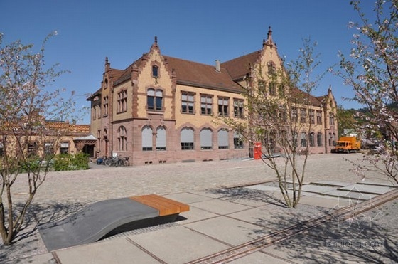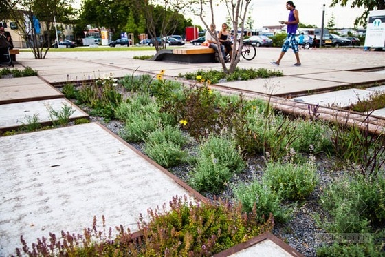 Zollhallen廣場是一個歷史悠久的海關大廳,在2009年被修復。該廣場是城市水敏感設計的一個典范,因為它不與下水道系統連接。美麗的種植園提供滲透點,地下的砂石壕溝和改革的內置過濾介質減少了下水道系統的液壓超載。鋸齒狀的廣場區域創建了一個地面洪水區。沒有雨水供給下水道,相反由地下水補給。這個作品是基于這里非常有歷史意義的火車站設計的。結實耐用的,多功能的長椅可以勾起人們對老火車站的回憶,并且老式鐵軌的遺跡也完好的保存了下來。一片明亮的櫻桃樹林提供足夠的陰涼,同時擁有多年生植物和觀賞草的種植園給了一種極具吸引力的柔軟性。100%的硬質景觀材料是從老火車站回收的高品質的拆卸材料。這不只從資源管理的角度上循環利用了材料,也使新的現代的設計與歷史悠久的海關大廳更加和諧。
