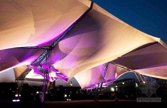 原有的兩座裝置——“網景”和“中央舞臺”曾分別是為2011年和2012年的畢業典禮設計的。而今年,使用了少量鋼結構和繩索支撐、并在彼此之間用彈性纖維牽線的“暴風云”裝置為展會賦予了新的生命,產生了意想不到的體量效果。從幾何學上來看,這個項目更像是一系列漏斗狀的物件堆疊,它們從直線狀的頂棚結構起源,一直向上延伸到一系列懸掛在視平線位置上的環狀物。根據這個項目最原始的概念,這些環狀物雖然只是簡單的幾何形,但是它卻以小見大,以最直接的途徑展現一幅復雜的織物圖案。這塊織物偶爾會呈半透明狀,于是上面的結構網絡會像鬼魅一樣魔幻,而其他時候不透明的起伏表面將會投下戲劇般的陰影。余興派對上的光源將會進一步延伸這種效果,屆時將有變幻的漸變彩色光源來點亮底部千奇百怪的漏斗。