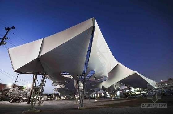在南加州建筑學院40年校慶之際,Oyler Wu事務所與該校學生協同設計并建造了這座“暴風云”裝置,以迎接2013年4月舉行的慶典活動。為了改造現有的“網景”展館, Oyler Wu事務所將這個項目視作一次機會為這個問題提供完全不同的解決方案。設計師們移除了一些總長達16公里的編織繩——它們曾在高空中的鋼桁架間懸掛,因此,這項計劃的改造不僅僅是在體量上,更是在物質上。