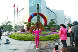 昨天,在西單路口一處主題為“中國航天”的國慶大型花壇前,一位女孩正在興奮地拍照留念。本報記者 和冠欣攝